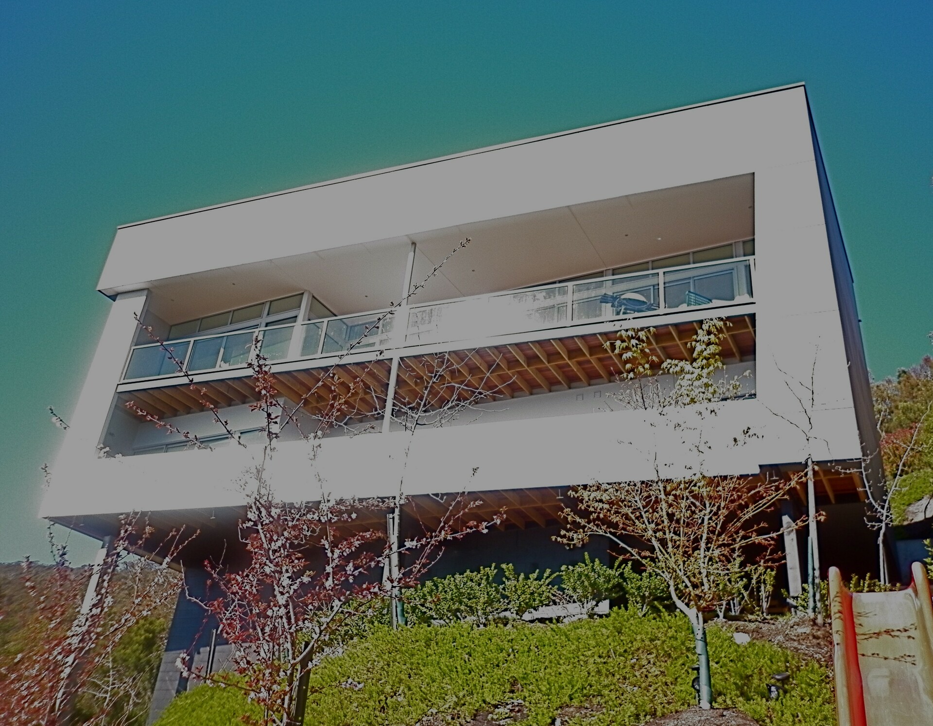 New house design on a steep block located in a bushfire prone zone and sunny views to the river Derwent.