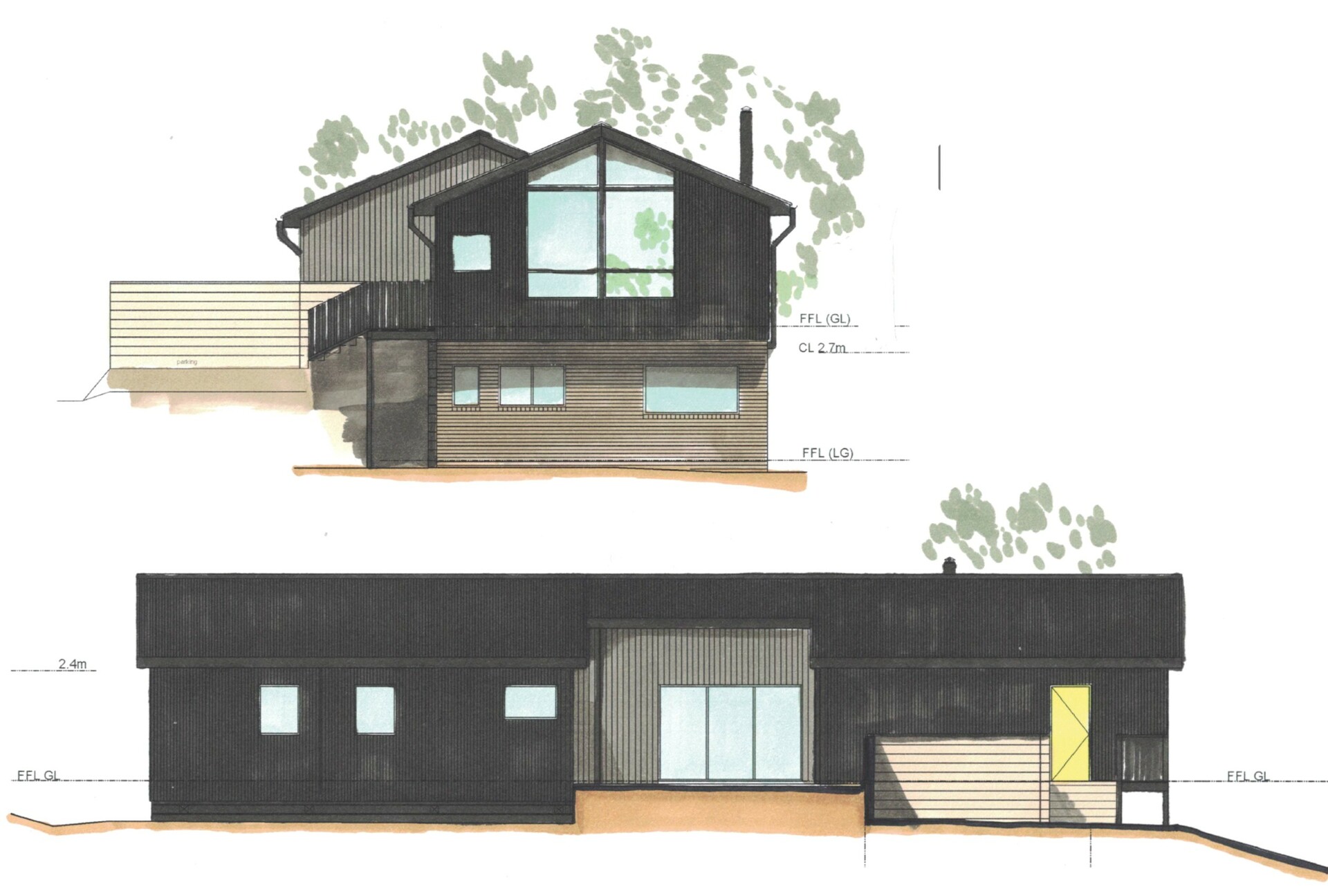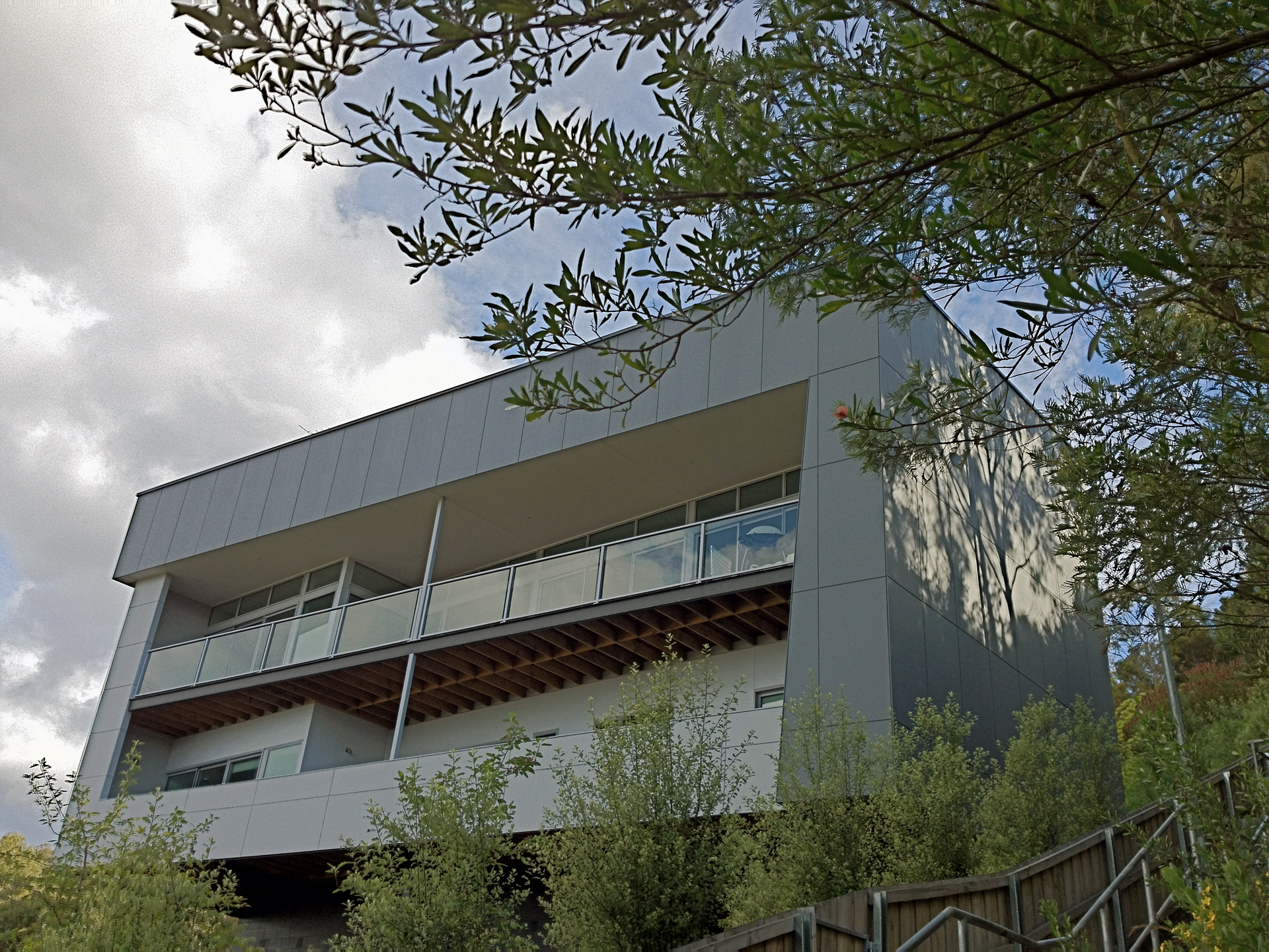 New house design on a steep block located in a bushfire prone zone and sunny views to the river Derwent.